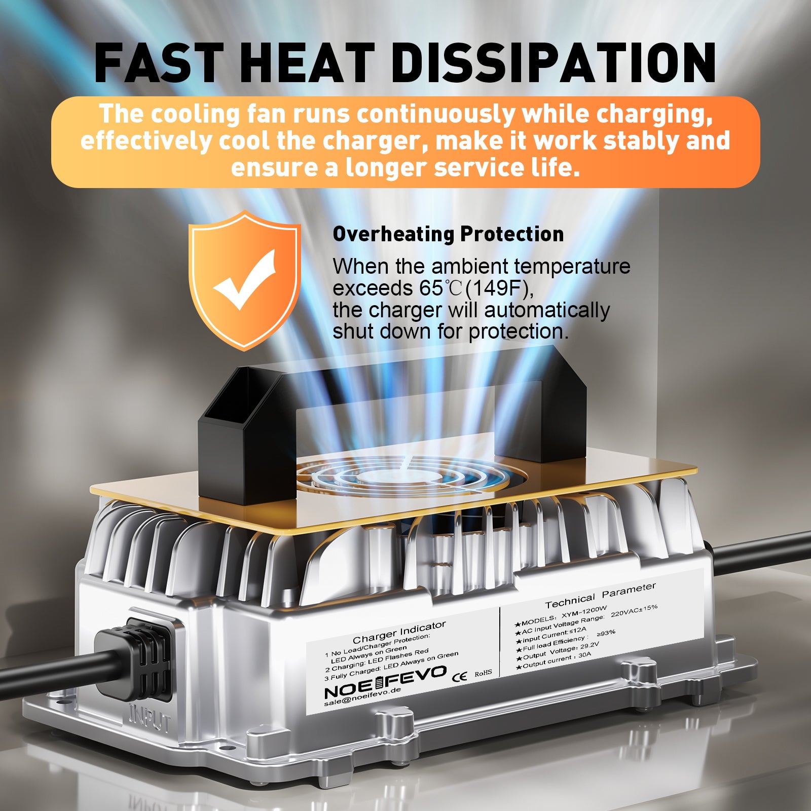 【29.2V Lithium Battery Charger】The Novifevo 29.2V 30A Lithium Battery Charger is designed for 24V (25.6V) LiFePO4 lithium batteries. Our charger supports a 0V charge function for reactivation or repair of unused batteries for a long time. Charge specifications: 25.6V | Charging current: 30A | Input voltage range: 200-240 Vac.[90% efficiency during charging]It provides up to 90% efficient charging for lithium (LiFePO4) iron phosphate battery.[Safety Protection During Charging]Safety features: Polarity protection, output short circuit protection, output overvoltage protection, battery isolation protection. Eliminate concerns about unsafe factors during the charging process.Specifications-Can charge 25.6V(24V) LiFePO4-Lithium three-stage charging curve-Input: 230V±10% AC*Up to 90% efficiency -Blower cooling-Black, auto-baked aluminum housing-Operating temperature range: 20~+45°C-Protection: Short-circuit/Protection against reverse battery insertion/Misconnect protection-Two-color LED display- Operable up to 5000m above sea level-Automatic shutdown at 100% charge.Packing List1*29.2V 30A Battery ChargerThis charger is delivered standard with crocodile clip and EU plug. If you need a different type of plug, please feel free to contact us.